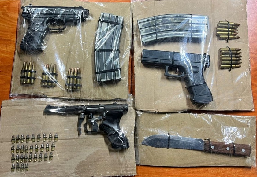 Ante esta situación, policías estatales iniciaron una persecución y lograron darles alcance metros adelante. Tras marcarles el alto y realizar una inspección preventiva conforme a los protocolos establecidos y con pleno respeto a los derechos humanos, se localizó en el interior del vehículo un arma de fuego calibre .22, dos objetos óptimos para agredir (réplicas de arma de fuego), un arma punzocortante, dos cargadores y 54 cartuchos de diferentes calibres.