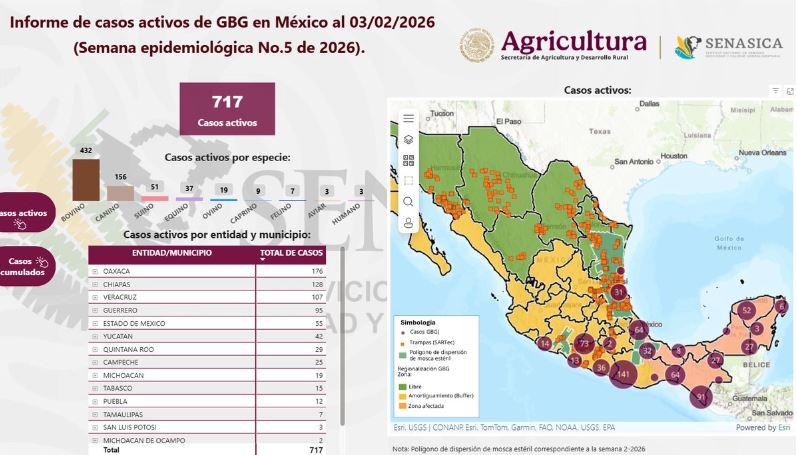 A través del Servicio Nacional de Sanidad, Inocuidad y Calidad Agroalimentaria (Senasica), el personal técnico atendió casos, recorrió más de mil 600 rutas sanitarias, inspeccionó más de 80 mil animales y aplicó tratamientos preventivos durante enero, lo que permitió reducir el número de casos activos.
