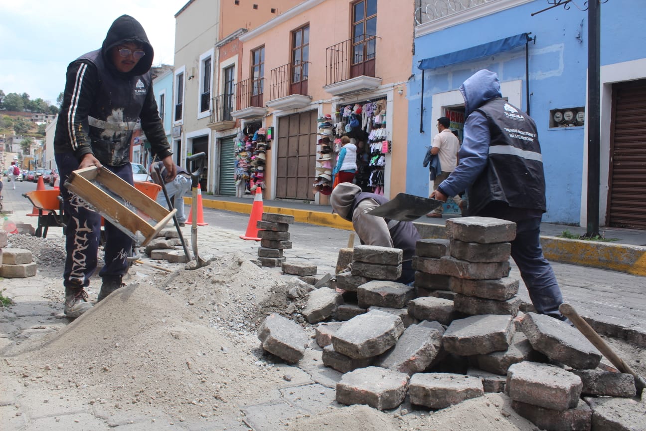 Como parte de estas labores integrales, en la calle Zitlalpopócatl, en la colonia Centro, se llevó a cabo la nivelación de adoquines, atendiendo una demanda ciudadana de esta zona de la capital.