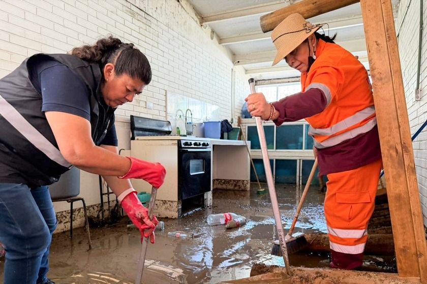 Con una respuesta de atención inmediata, brigadas del programa “Más territorio y menos escritorio”, madres de familia y elementos del Ejército Mexicano llevan a cabo labores conjuntas de desazolve y limpieza.