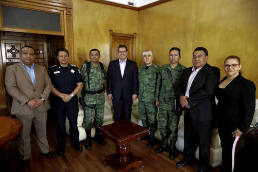 Al encuentro asistieron el General de Brigada Diplomado de Estado Mayor, Miguel Hurtado Ochoa, Comandante de la 23 Zona Militar; el Coronel Manuel Ramos Barrera, Comandante del Primer Regimiento Mecanizado; José Aarón Pérez Carro, Secretario de Gobierno; José Antonio Aquiahuatl Sánchez, Procurador General de Justicia del Estado; Eduardo Valiente Hernández, Secretario de Seguridad Ciudadana; y Ana Belén Rúa Lugo, Comisionada Ejecutiva del Sistema Estatal de Seguridad Pública. (Boletín)
