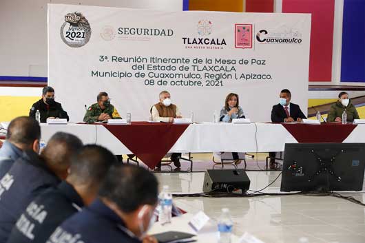 La gobernadora Lorena Cuéllar Cisneros encabezó la "Mesa de trabajo para la Construcción de Paz y Seguridad Región I" en el municipio de Cuaxomulco, a fin de reforzar las acciones en coordinación con las autoridades de los tres niveles de gobierno para disminuir cualquier tipo de violencia en la entidad.